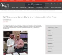Article on AUB website regarding biography of AUB Alumni Samer Harb, the first Lebanese Certified food scientist in the world food consultation